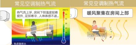 这些空调制热时,热气流在房间内上浮,暖空气聚集在房间上部,房间下部温度较难提升,人们的足部感到寒冷,体感不适。