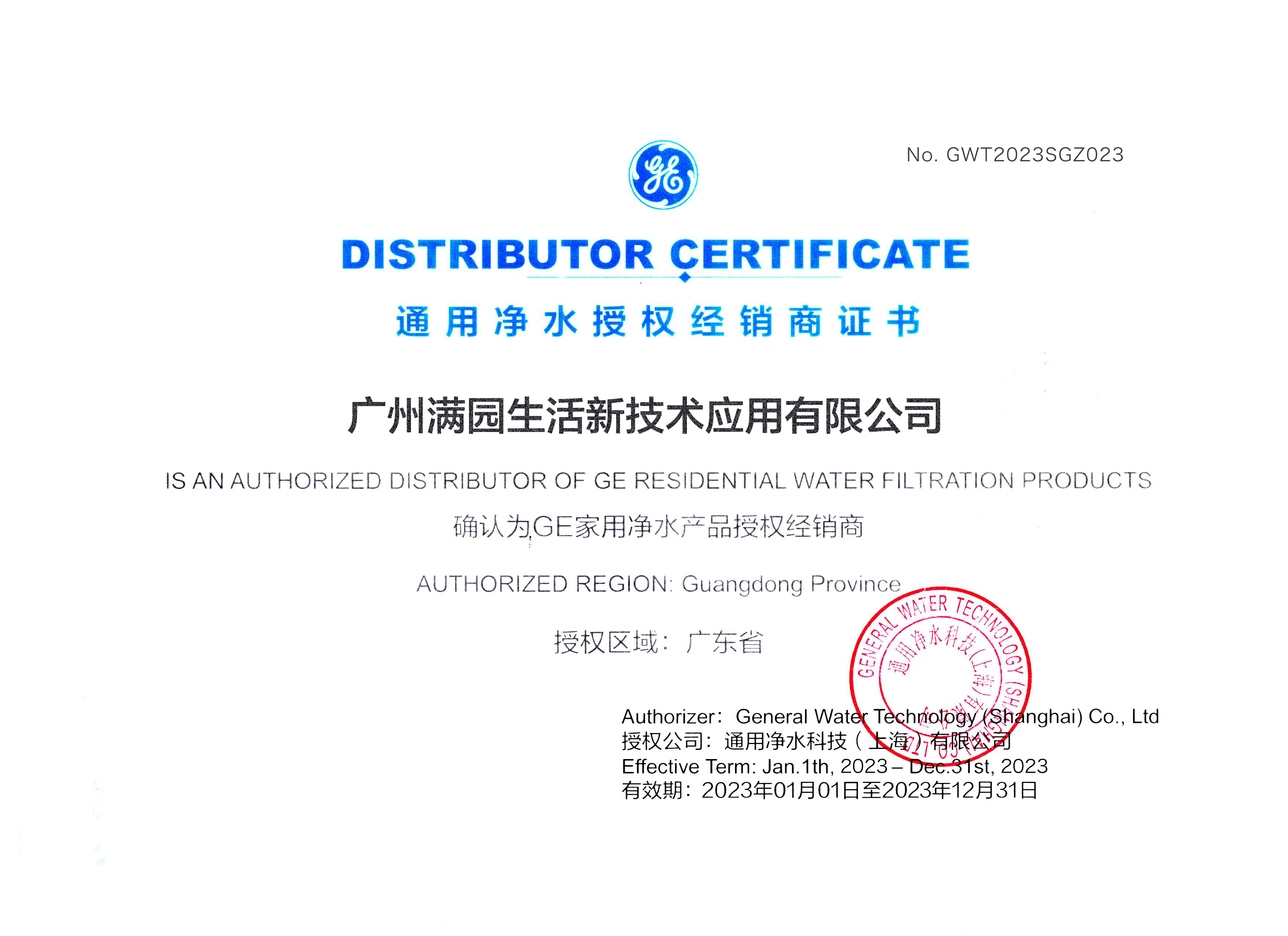 GE授权证书